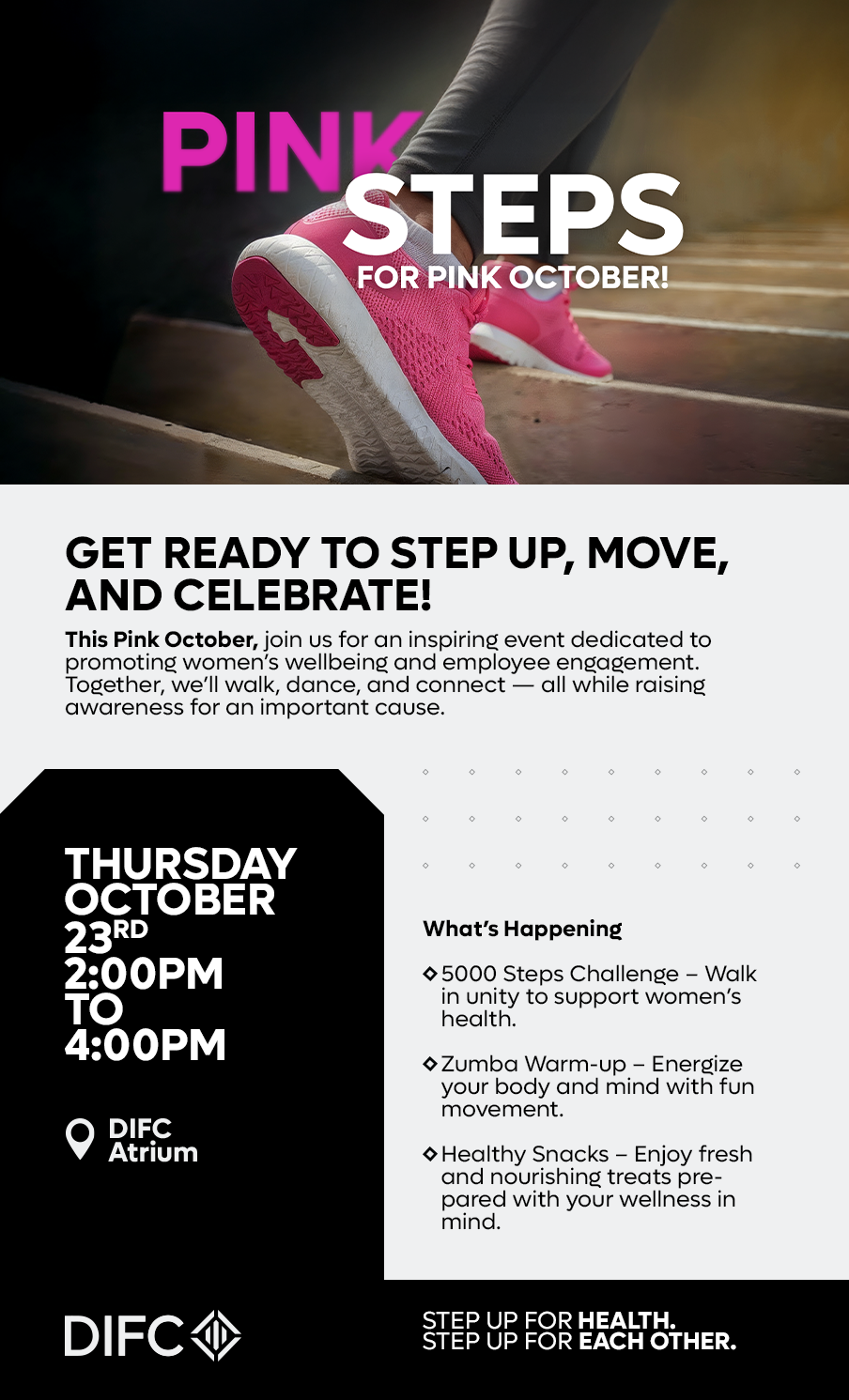 Take the '5,000 Steps Challenge' and walk in unity for breast cancer awareness, energise your mind and body with a Zumba warm-up, and end the day with fresh and healthy treats.